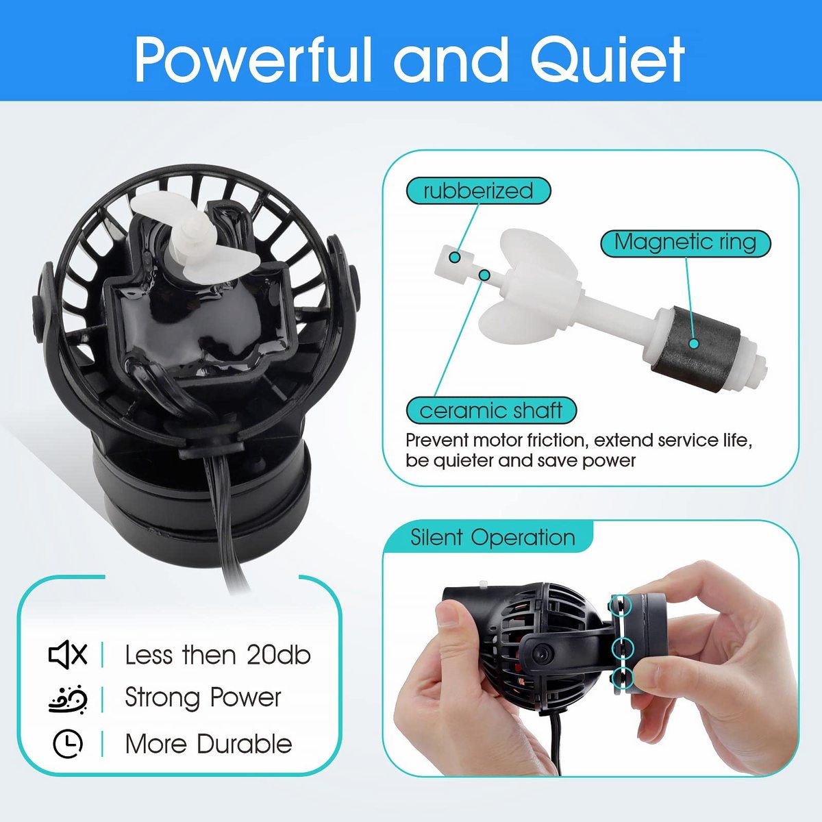 ?Aquarium Water Circulation?This wave maker simulates the natural flow of river or ocean, creating water movement for fish to swim in and a healthy living environment for your aquarium pets; It allows the tall plants to move fluidly, giving the aquarium a more natusral look; And agitates the top water to increase the dissolved oxygen for fish, corals or plants to thrive,?Powerful Quiet?This 6W, 1320GPH aquarium powerhead is higher flow rates and lower energy consumption. Single head makes strong waves to circulate the water quietly and efficiently. It is ideal for 15~120 gallon freshwater tank or saltwater tank. The ultra-quiet propeller and motor, as well as the new shock-absorbing spike design, allowing the pump to run virtually silent,?Enhance Filtration?360 rotating flow direction, can easily stir debris towards the filter and prevent them from settling at the bottom. It can eliminate dead ends, improve water quality and keep water clean. Its submersible oil-free motor, environmentally friendly and pollution-free. Saves your tons of energy for cleaning fish tank,?Easy to Install?This aquarium powerhead with a strong magnetic bracket which is easy to install and allows you to position the pump virtually anywhere in your aquarium. Small profile so it doesn't take up much space in the tank. Just suck the cupule to anywhere of the in wall, plug in the power and it works,?Wide Application?Its axis are made of wear and corrosion resistant ceramics, safe for use in fresh and salt water, various fish tanks, aquatic aquariums, coral aquariums. Dimension: 4.1 x 2.5 x 2.5 inches (L x W x H); Length of Power Cord: 6ft (1.87m); includes: 1pcs 1320 GPH aquarium wavemaker (w/1 magnet suction base, 2 suction cups). In the remote possibility that you?re not satisfied with our product, just contact us, and we will gladly give you a new Circulation Pump replacement.