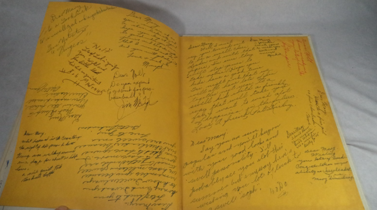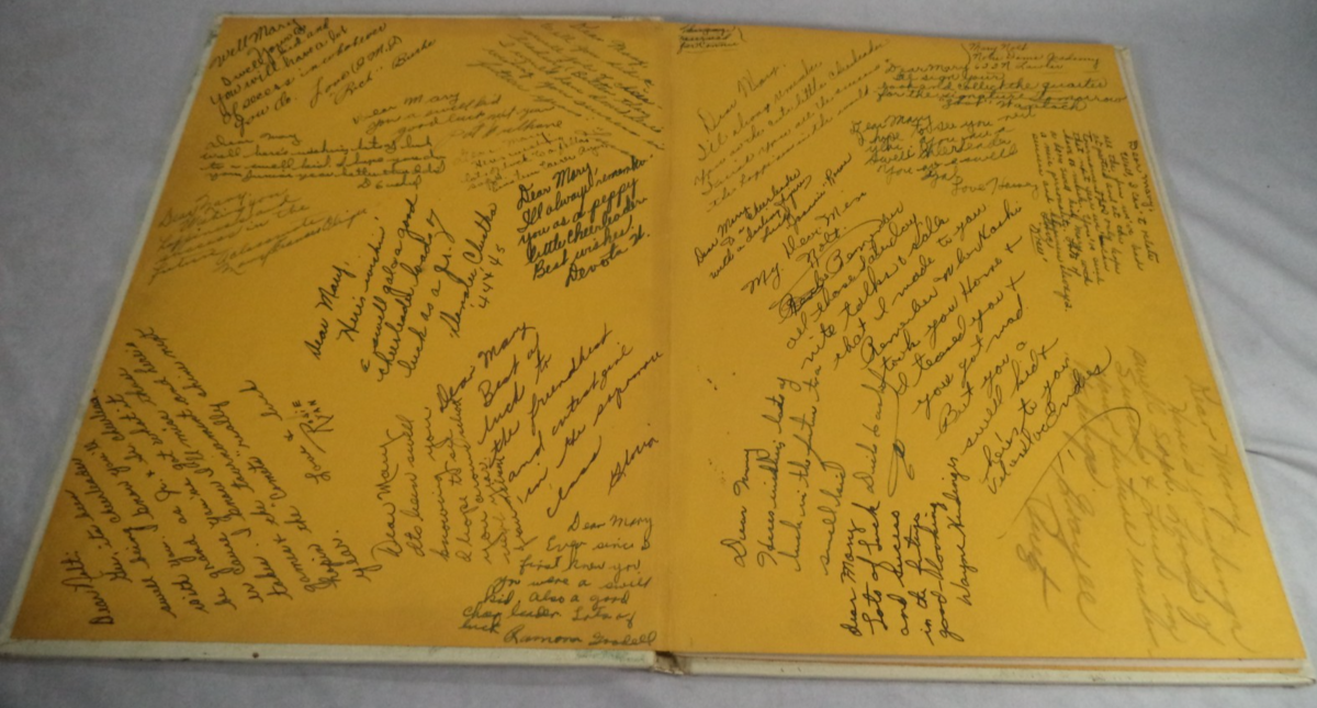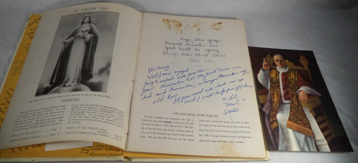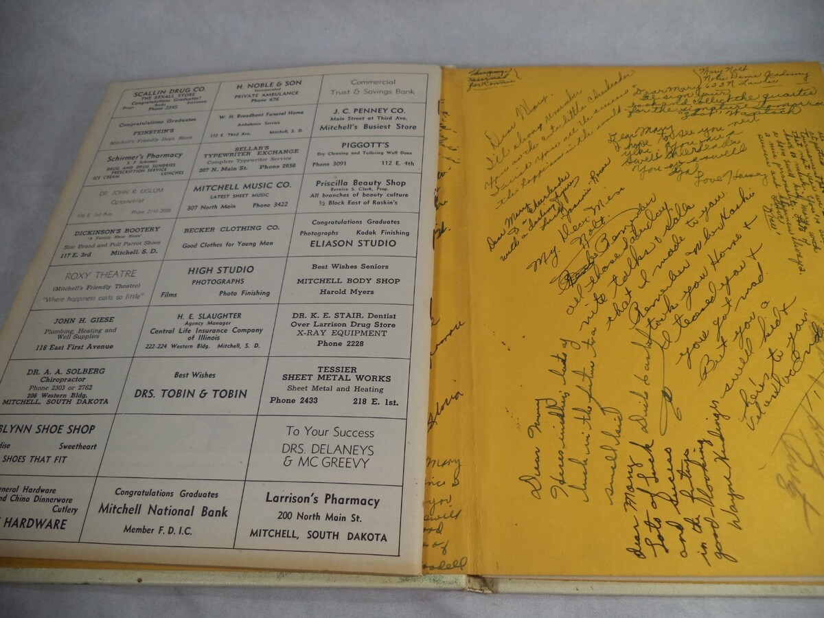 Description: The 1945 Mantle Yearbook from Notre Dame Junior Catholic College and Academy in Mitchell, SD is a rare and valuable piece of historical memorabilia for collectors interested in colleges and universities. This original yearbook, signed by students and staff, provides a unique glimpse into the academic and social life of the institution during that time period. With a focus on teaching and education, this piece of Americana from the United States offers a fascinating look back at the educational landscape of the mid-20th century. 8" x 11". Lots of signatures!