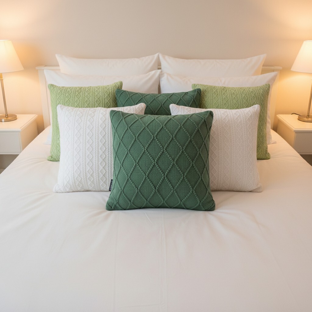 Enhance your home with the SOGA 6PC Fresh Pure Cable Knit Green Diamond Decorative Pillowcase Set, a perfect blend of freshness, texture, and elegance. Featuring crisp white cable knit fabrics paired with rich green diamond patterns, this 6-piece set of 45cm pillow covers adds a cozy, stylish, and layered accent to sofas, beds, or accent chairs.