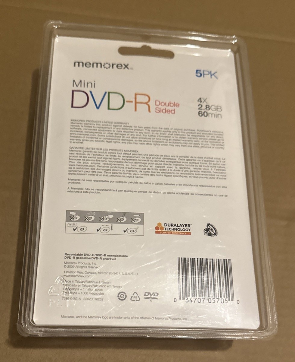 The Memorex Mini DVD-R 5 Pack is a set of 5 double-sided discs with a capacity of 2.8GB each, designed for use with DVD camcorders. The discs feature a slimline jewel case packaging and come with a cleaning cloth for easy maintenance. With a maximum write speed of 4x, these recordable discs are perfect for long-run storage and are scratch-resistant for added durability. Manufactured in 2006 in Taiwan, this product is ideal for those looking for high-quality, reliable blank media for their DVD recording needs.