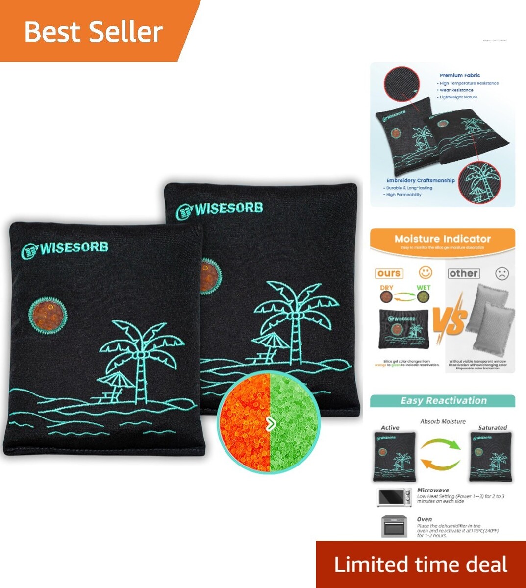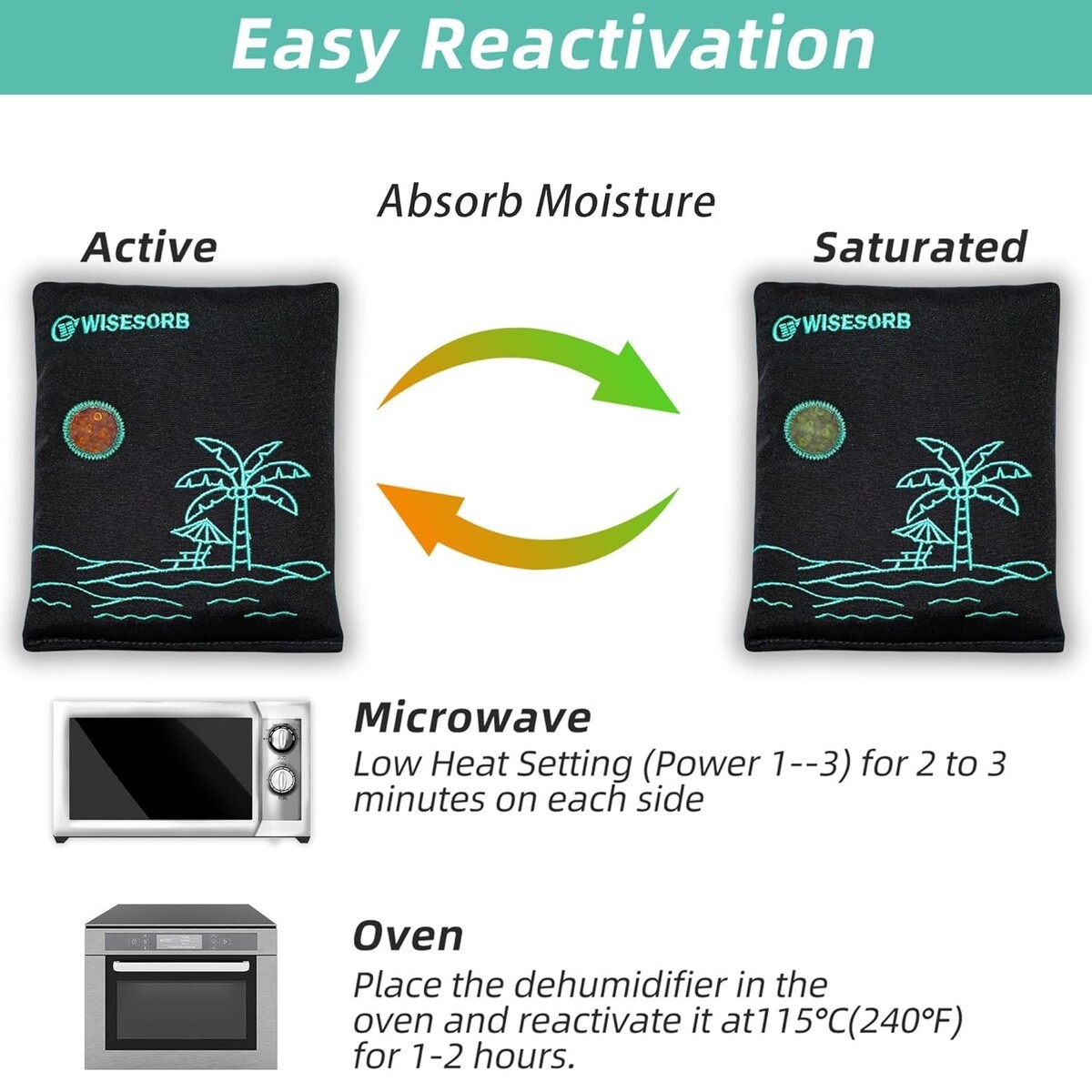 Easy Reactivation: Reactivate moisture absorbers effortlessly! In a microwave, simply heat for 2 minutes on each side at low power (levels 1-3). For oven reactivation, place packs in the oven for 1 to 2 hours at 200F to 250F.