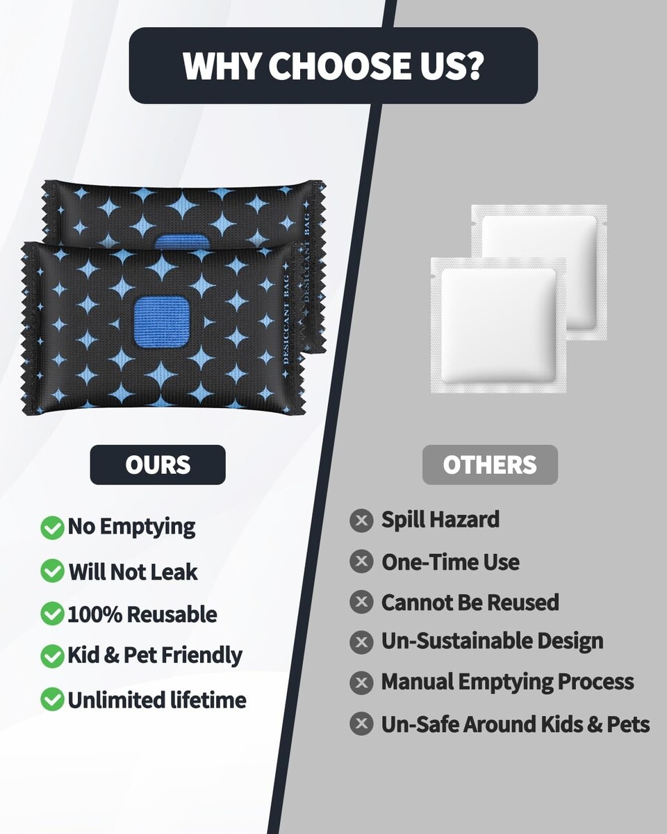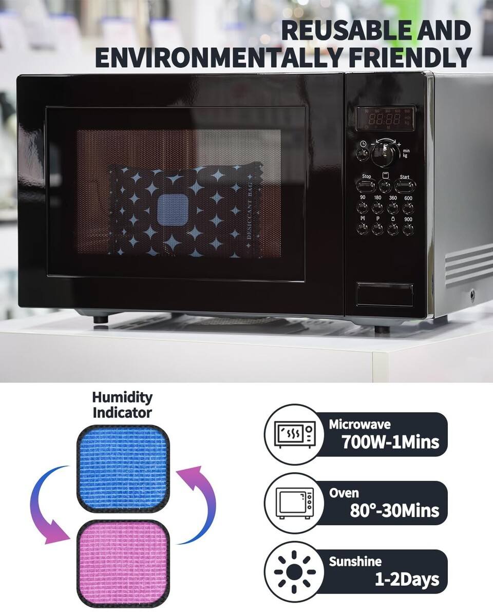 Renewable and Reusable Design: For ongoing moisture absorption, simply microwave the pack for 3 minutes to reactivate its capabilities, or leave it in the sun until the humidity indicator light turns blue.