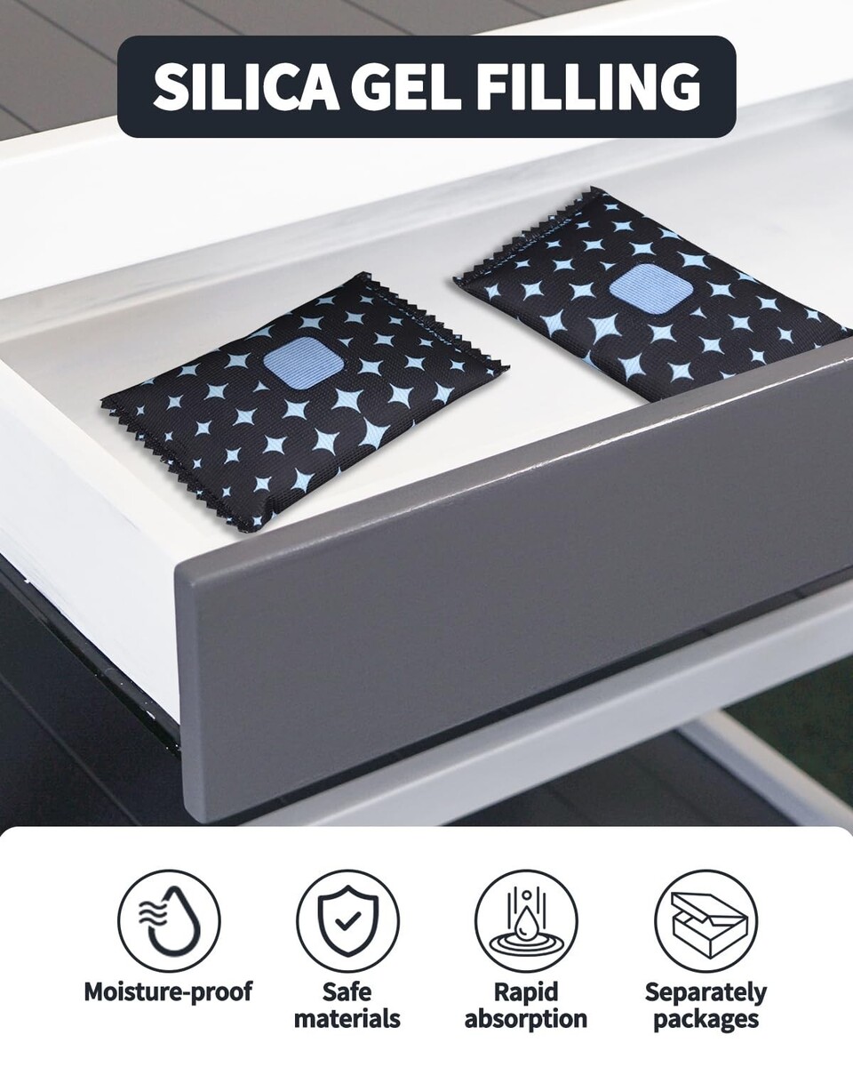 Effective Moisture Absorbers: Encased in silica gel, our packs absorb moisture seamlessly without leakage. Perfect for closets, drawers, luggage, electronics, collectibles, and photographs.