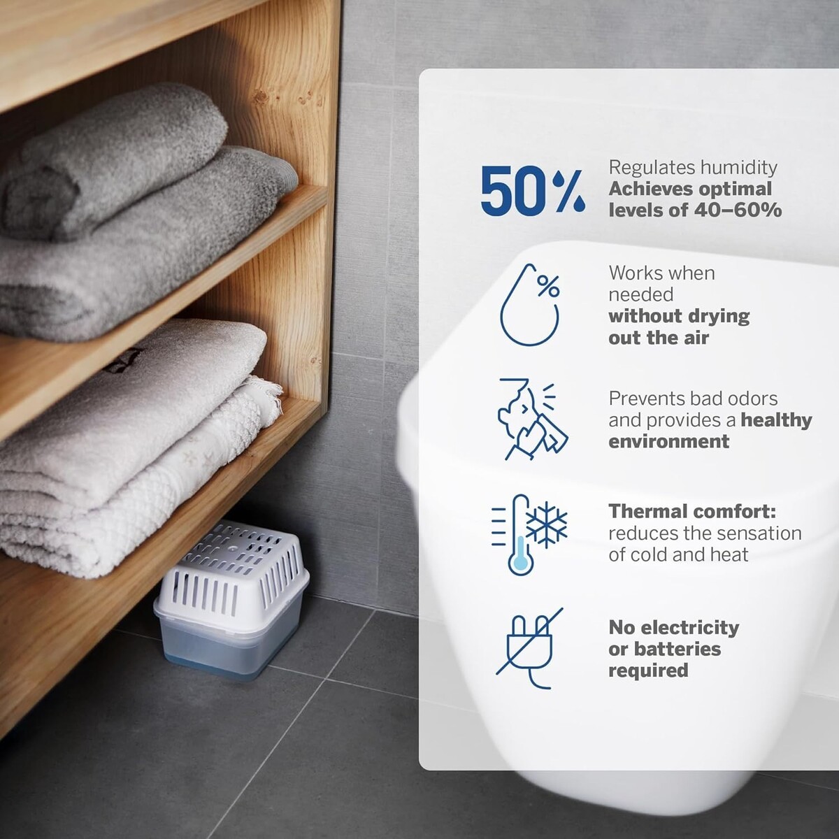 Controls humidity levels between 40-60% for a fresher environment.