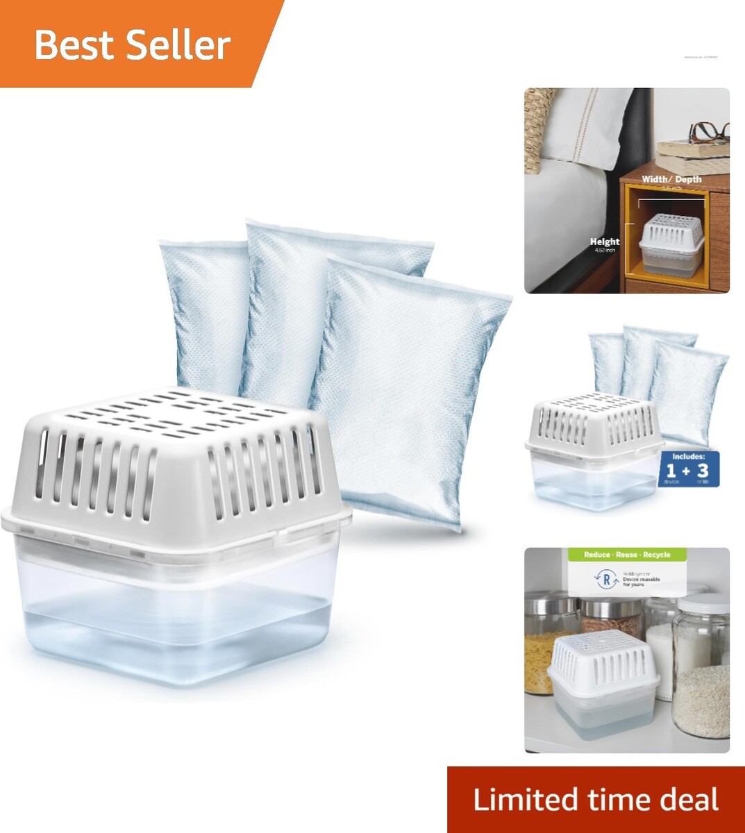 Perfectly tailored for small spaces, this humidity control device includes one reusable 8.8 oz moisture absorber and three pre-measured refills, ensuring of effective humidity regulation.