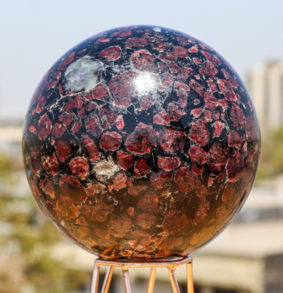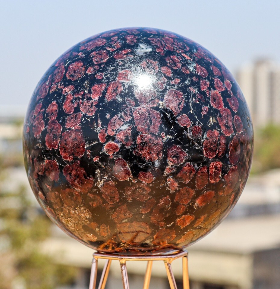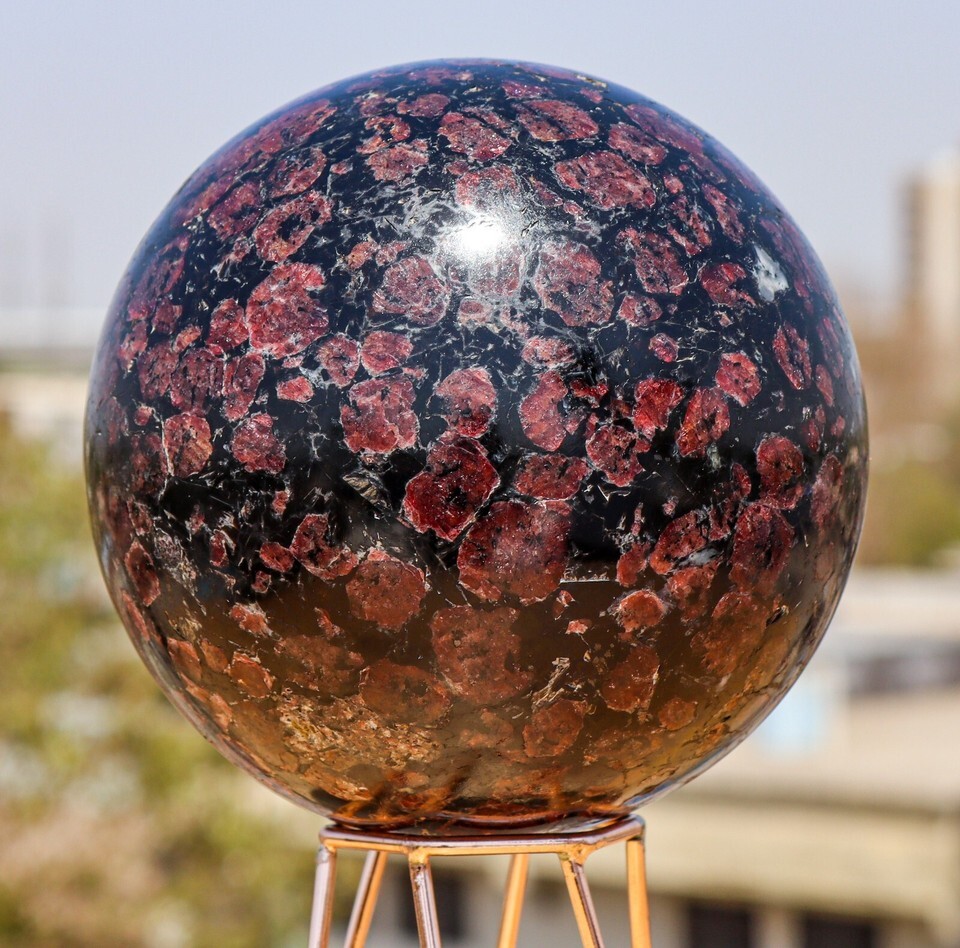 Hand Carved Raw 130mm Natural Polished Red and Black Garnet Astrophylite Crystal Quartz Healing Stone Sphere Specimen For Healing, Fengshui, Reiki, Aura, Meditation, Metaphysical, Decoration and Minerals Specimen with metal stand.