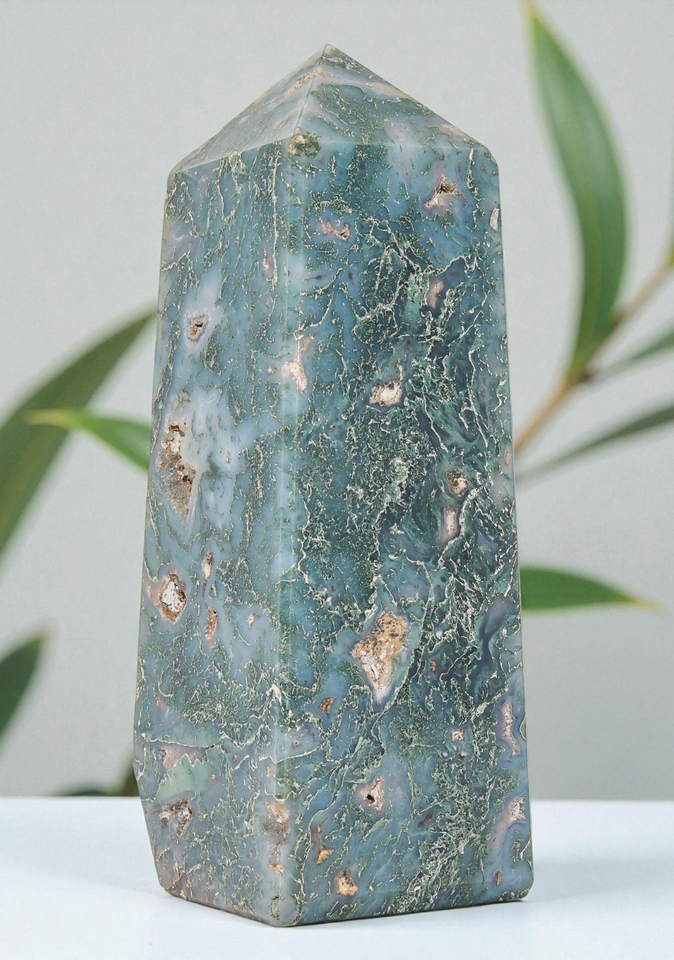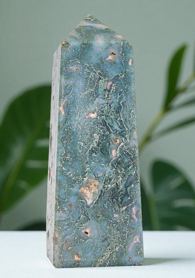 A moss agate obelisk wand is believed to offer benefits like promoting spiritual and physical growth, enhancing emotional balance, and attracting abundance. The combination of the obelisk shape, which is said to focus and direct energy, and the properties of moss agate creates a tool for deep meditation, grounding, fostering a connection with nature, and boosting creativity.