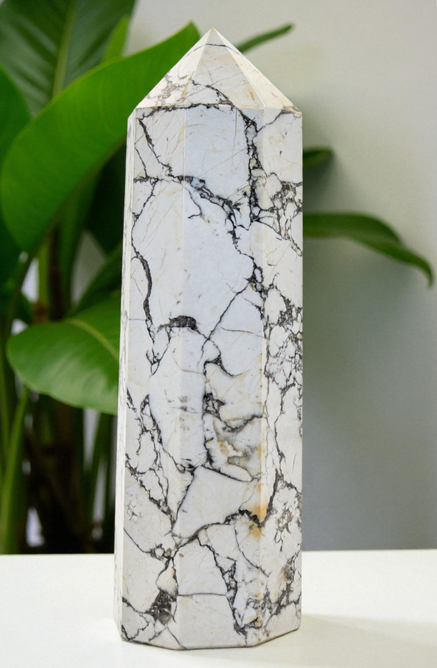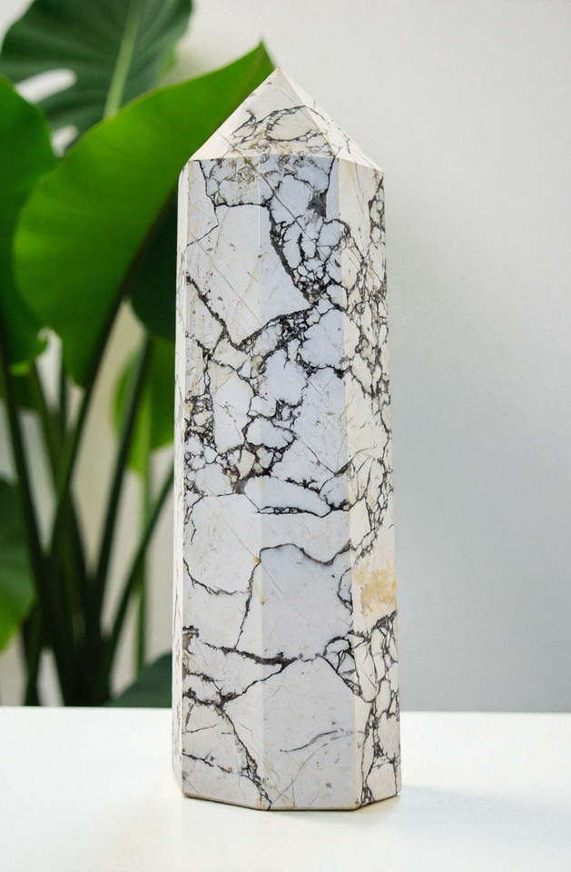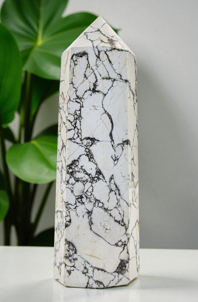 Superb 160MM Polished White Howlite Crystal Healing Stone Wand Statue Tower Specimen For Healing, Fengshui, Reiki, Aura, Meditation, Metaphysical, Decoration and Minerals Specimen.