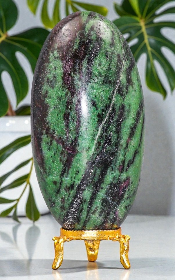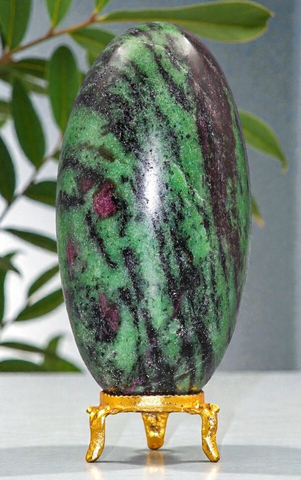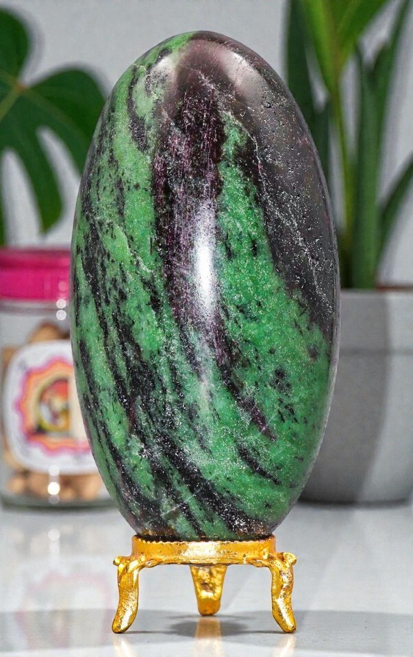 This A+ Green Ruby Zoisite Crystal Anyolite Healing Reiki Energy Gemstone Lingam is a stunning 105mm polished stone Lingam here originating from India. The sphere features a beautiful combination of green and pink hues with black streaks, making it a striking addition to any crystal collection. With its unique properties and healing properties, this Ruby Zoisite Lingam is perfect for those seeking a powerful and vibrant gemstone for their collection or for use in Reiki or other energy healing practices.