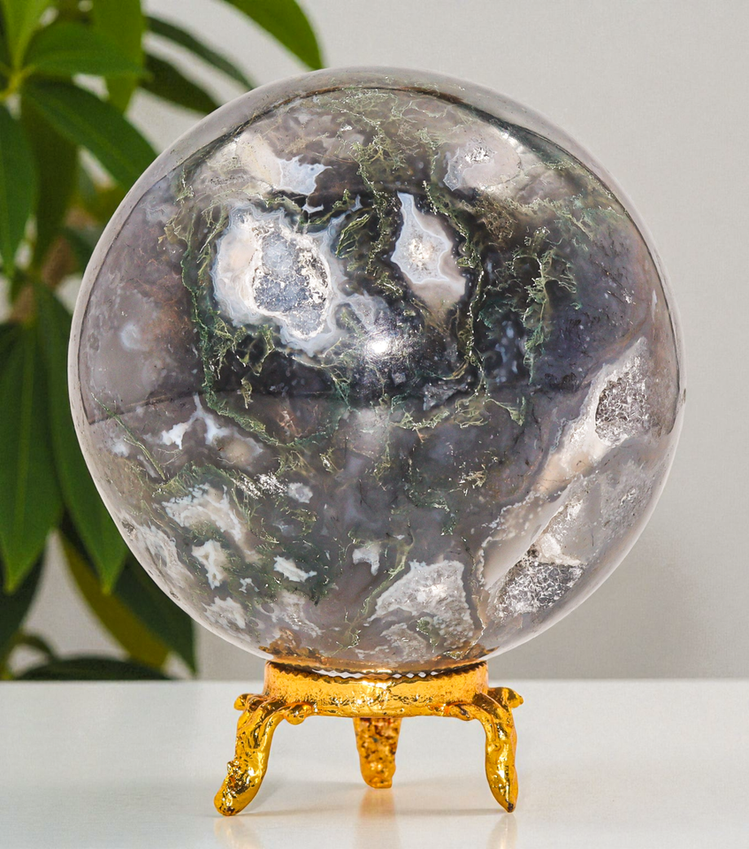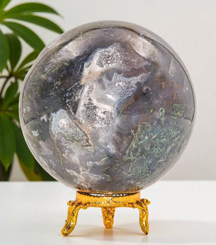 This is a stunning Grey Green color Moss Agate Sphere,