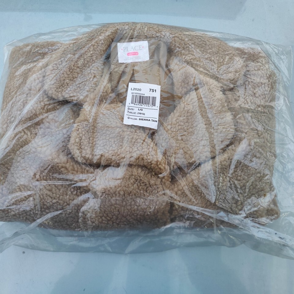 This is a new with tag The Children's Place Girls Teddy Sherpa Coat in brown sierra tan, size L 10/12. The coat is made of fleece outer shell material with 100% polyester lining. It is machine washable and features a faux fur vest style, perfect for winter and fall seasons. The regular fit coat is designed for girls and is a stylish and cozy outerwear option for young children. Made in Indonesia, this coat is a great addition to any girl's winter wardrobe.