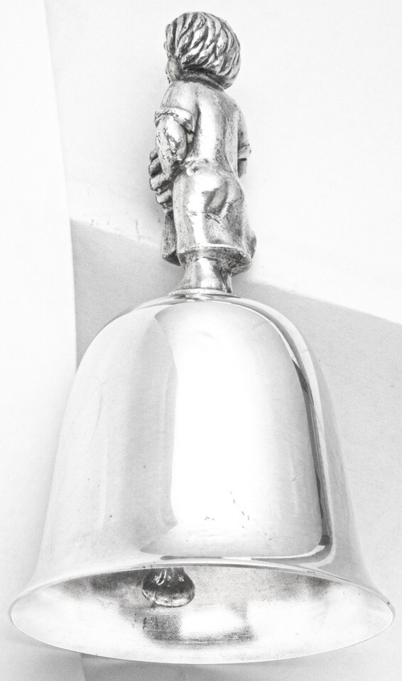 (One) Polished Silver-plated Christmas Bell with Little boy holding wrapped gift / present.