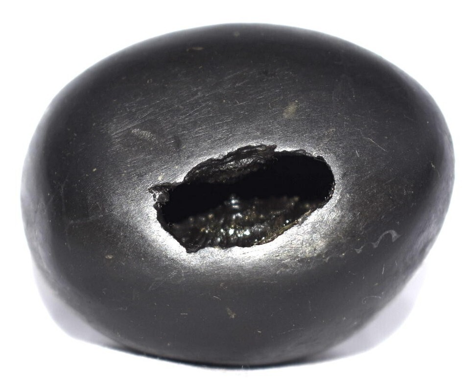Round Shape , Black Color body , Single opening having 2 equal chakras , mark of white lines at the bottom .