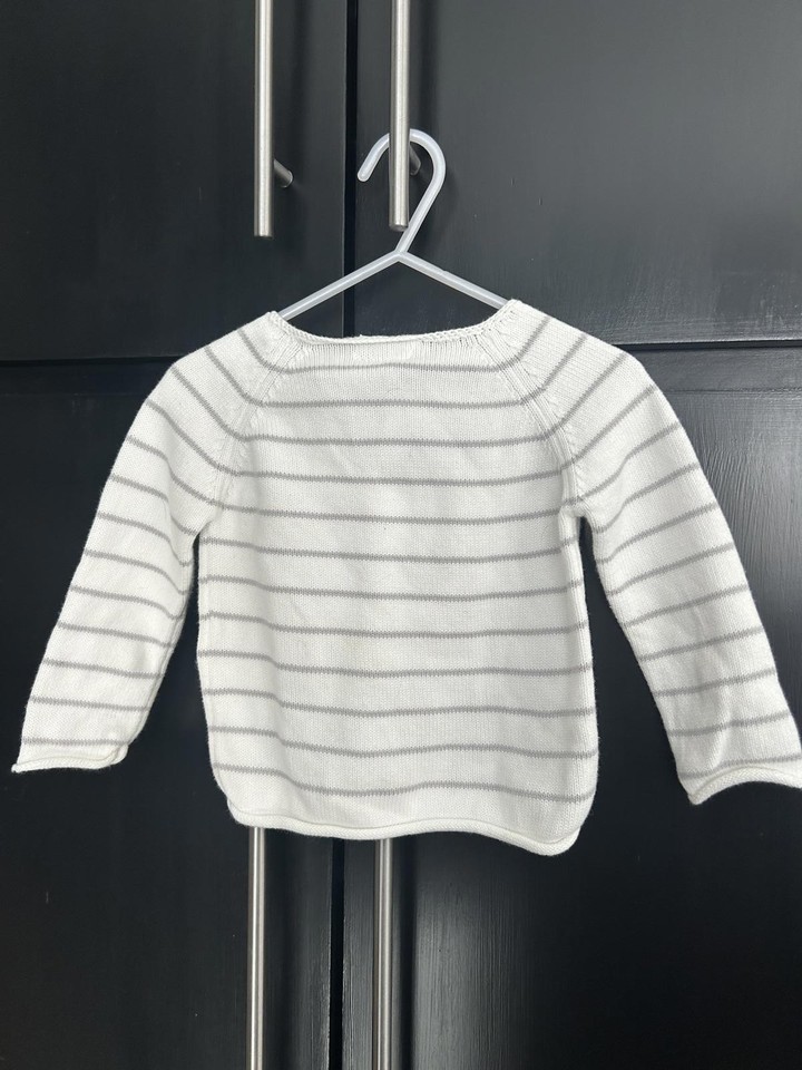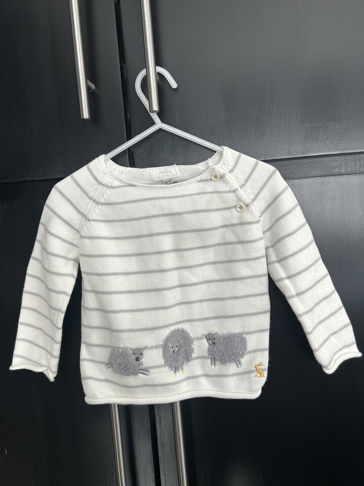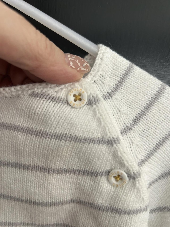 Adorable Joules baby sweater featuring white and gray horizontal stripes. Soft knit fabric with charming sheep embroidery along the hem. Button closure on shoulder for easy dressing. Comfortable and stylish for everyday wear.