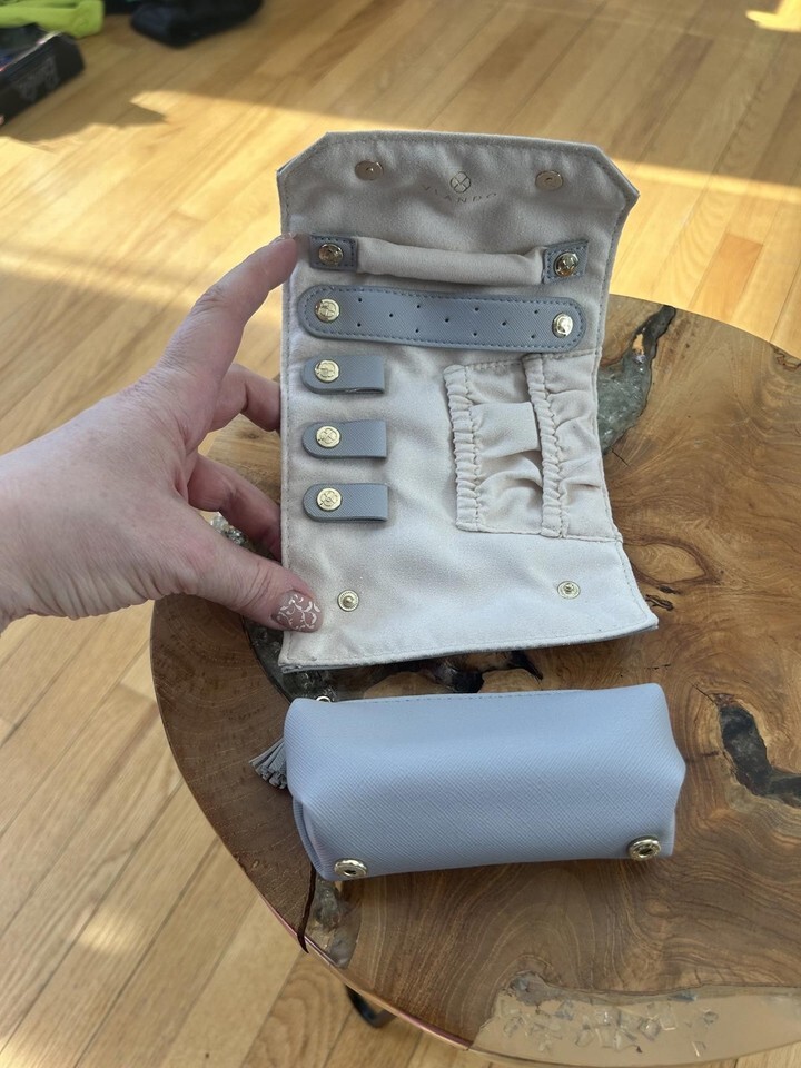Compact and elegant jewelry organizer by Viando. Features multiple snap closures, a zippered pouch, and elastic compartments for rings or small accessories. Perfect for travel or everyday use to keep your jewelry secure and organized.