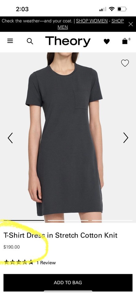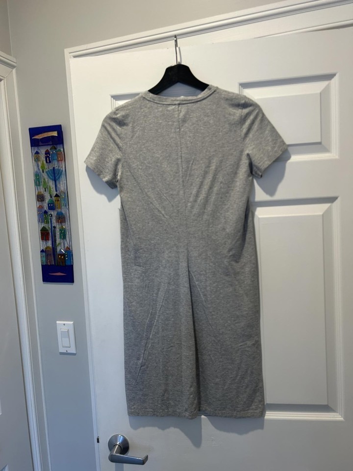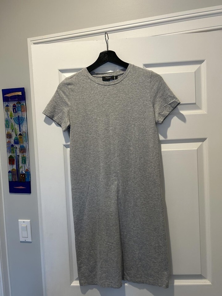 Comfortable and stylish gray short sleeve dress by Theory. Made with soft, breathable fabric suitable for casual wear. Features a simple round neckline and a relaxed fit that falls just below the knee. Perfect for everyday use or casual outings.