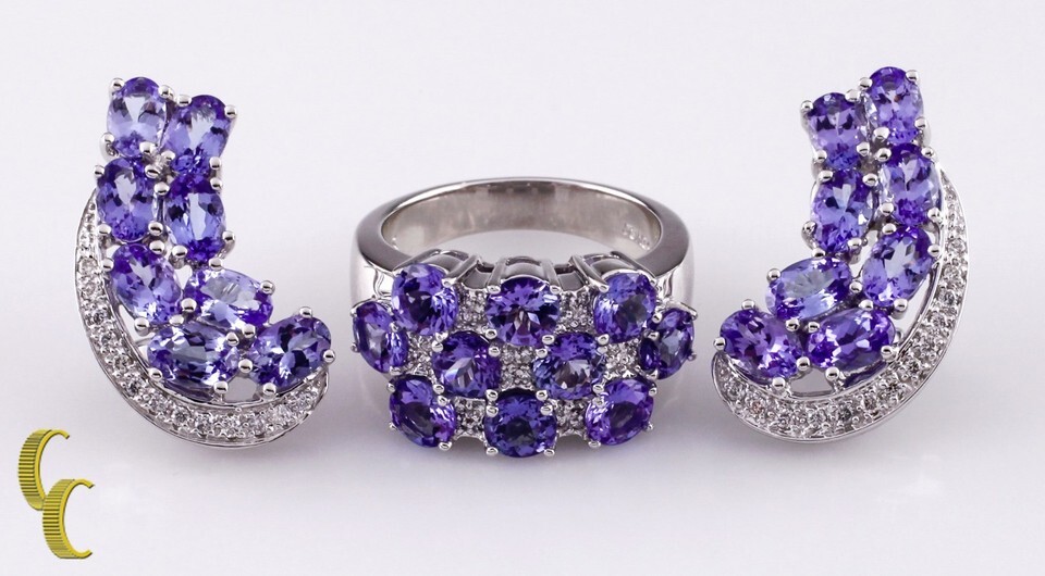 Authenticity Guarantee Iolite and Diamond 14k White Gold Earring and Ring Je...