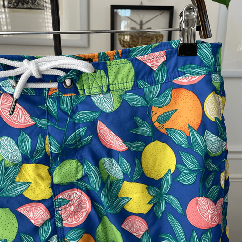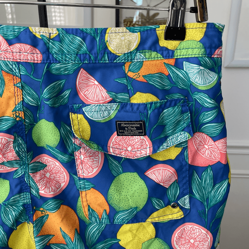 Men?s Abercrombie and Fitch swim trunks with a 7 inch inseam and a bold and colorful print of citrus, fruit, including lemons, limes, grapefruit, and leaves on blue background. Hook and loop fly closure and waste. Lined. Single flap back pocket with branding patch on the flap and hook and loop closure. Tax size 33, which according to Abercrombie?s size chart is roughly a men?s large. I have listed it as such if the drop-down does not allow for 33 size. Measure 17 inches straight across the waist with a 12 inch rise. Please double check measurements to ensure proper fit for you.