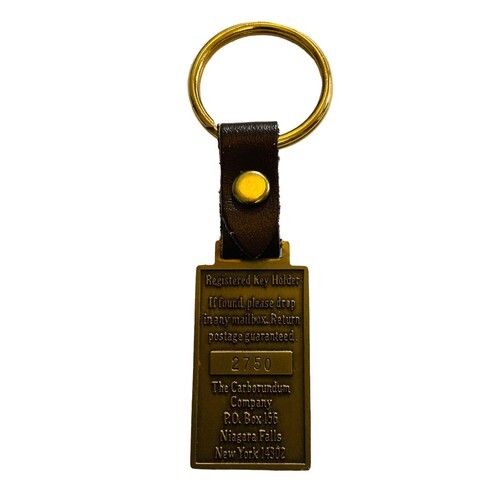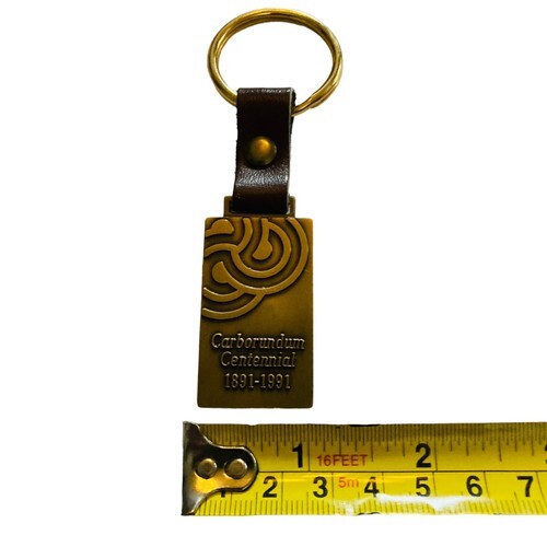 This is a vintage brass and brown leather keychain from 1991. Celebrating the Carburundum Centennial 1891-1991. Has an embossed design on the front with the Centennial information. On the back it says ?Registered Key Holder? 2750. The address is The Carburundum Company in Niagara Falls, New York. A cool collectible!