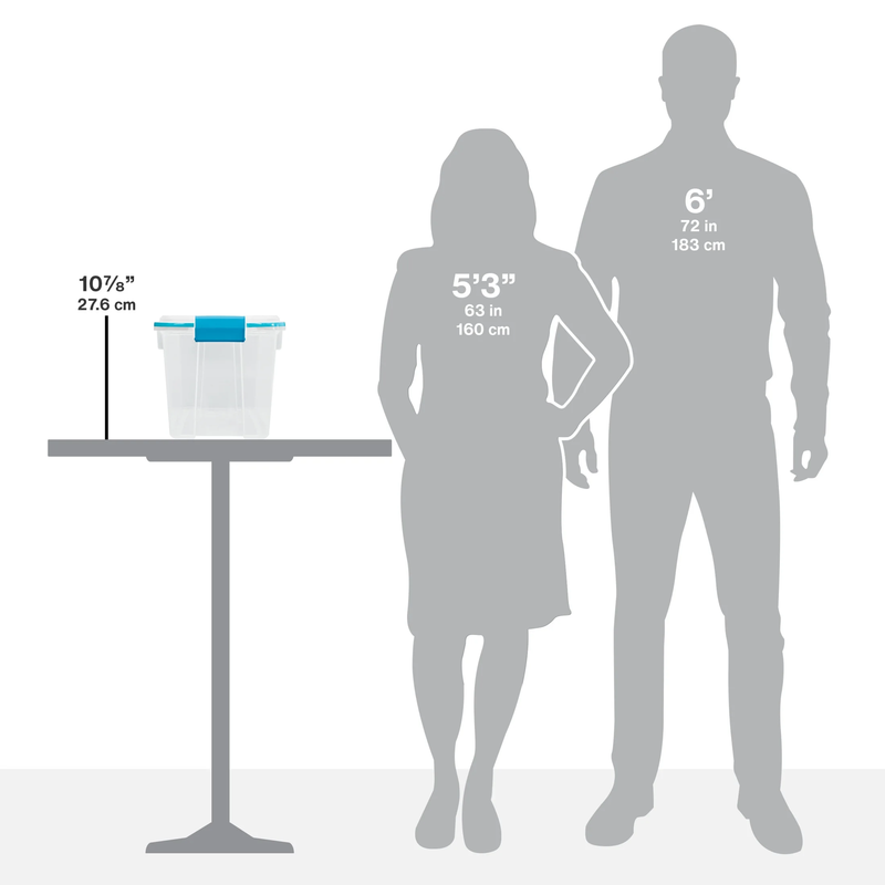 Sterilite 20 Quart Gasket Box, Weather-Resistant Small Clear Storage Bin with Latch Lid, Blue Outside Dimensions: 16 1/8" x 11 1/4" x 10 7/8" Interior Dimensions at bottom: 12" x 8 5/8" x 9 5/8" Gasket seal and tight-fitting latches keep lid secured to base and safeguards contents Clear plastic lid and base allows you to view contents at a glance, without having to open the container Recessed lid allows bins to stack neatly to maximize vertical space The 12 Qt and 20 Qt bins use the same size lid, allowing both sizes to be stacked in same footprint Ideal step up storage solution for those items that need to be packed away and protected Use good judgment when stacking items, keep heaviest bin at the bottom BPA-free and phthalate-free