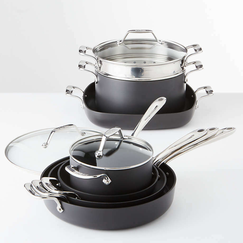 Imported All-Clad Essentials Non-Stick 10-Piece Set: 8.5" fry pan, 10.5" fry pan, 4-t. lidded saute pan, 2.5-qt. lidded saucepan, 7-qt. lidded stockpot, 13" square pan and steaming/straining insert.