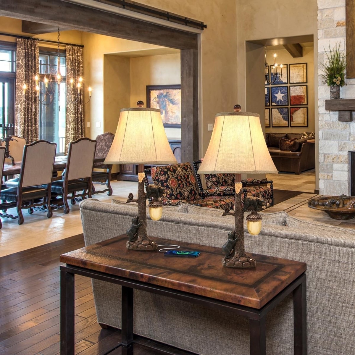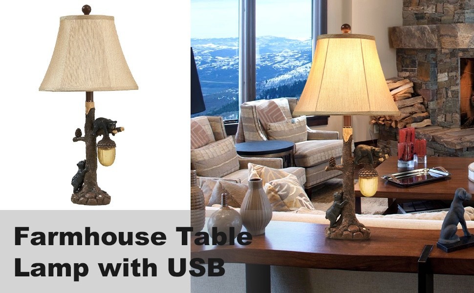 2 Rustic Bear Table Nightstand Lamps Touch Lights USB Dimmable Cabin Home Decor