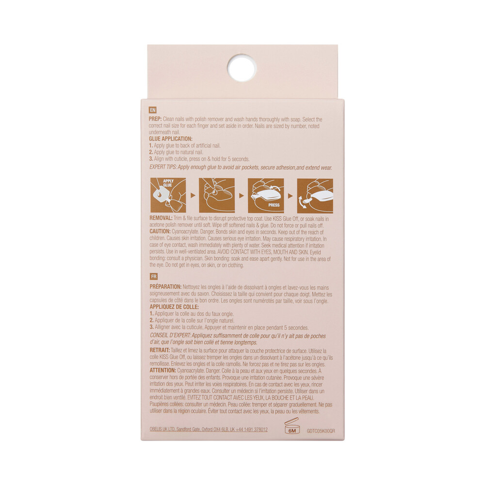 Trim file surface to disrupt protective top cat. Apply Kiss Glue Off remover between artificial and natural nails or soak nails in acetone polish remover until soft. Wipe of softened nails and glue. Do not force or pull nails off.