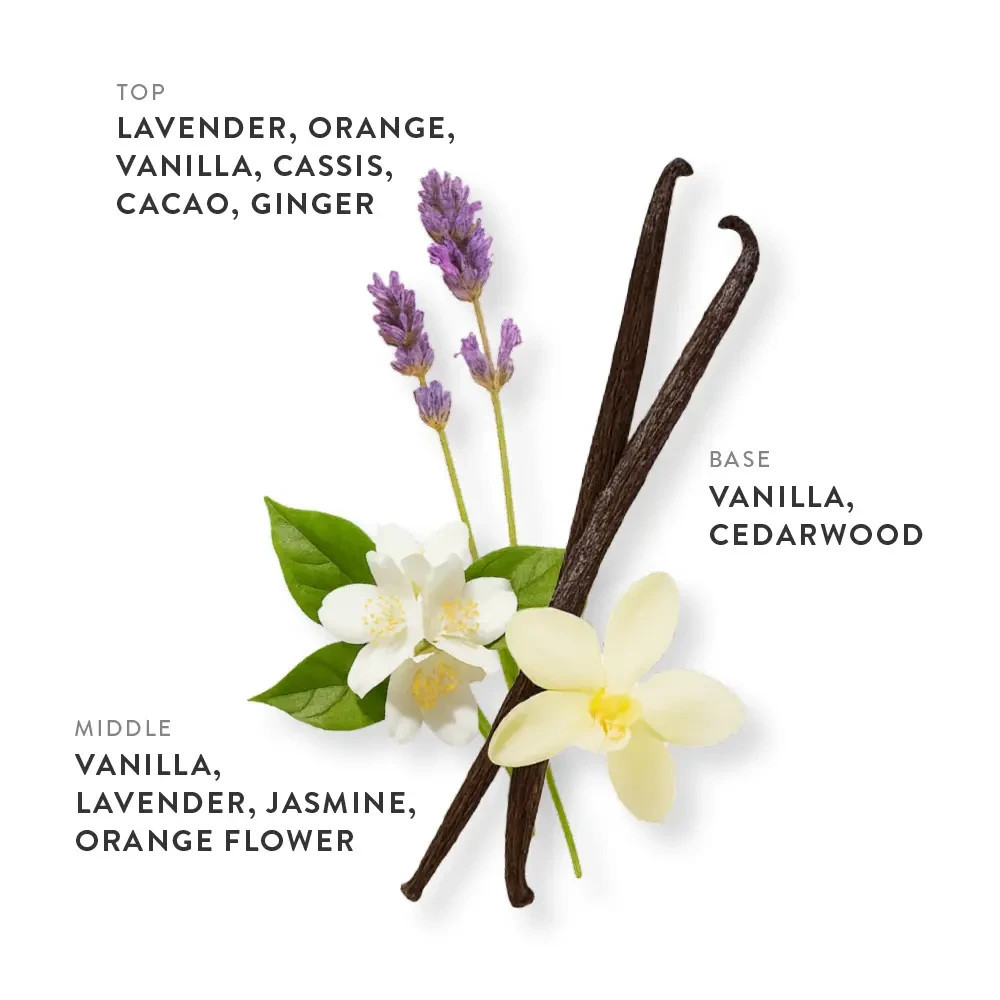 Scent Description: Cool lavender meets sweet vanilla and rich cacao in a smooth, indulgent opening. Orange flower and jasmine add floral elegance, while warm woods leave a soft, modern trail that feels effortlessly chic and subtly sweet.