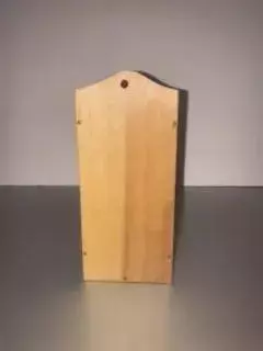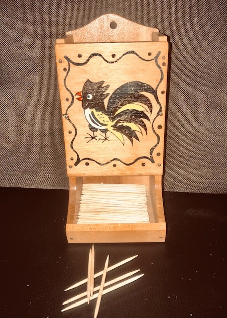 This charming vintage RoosterWare toothpick or match stick holder dates back to the mid-century era, likely the 1950s or early1960s. It features a hand-painted, folk art style rooster graphic in black, yellow, and red hues, accented with a black scroll border and decorative dots. The natural wood finish complements farmhouse or retro kitchen decor, and while it may show minor signs of age consistent with vintage items, it is a delightful and functional collectible piece.