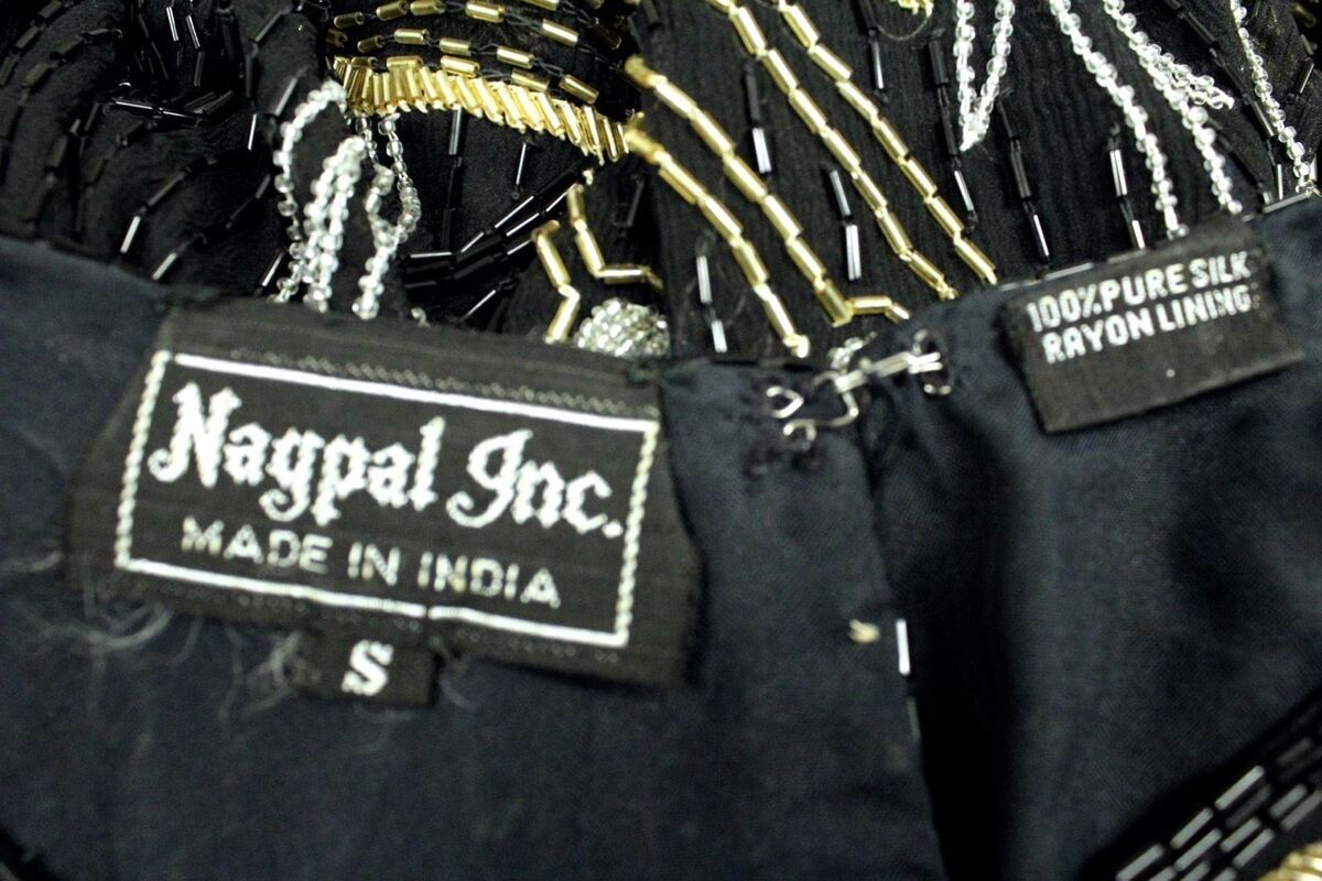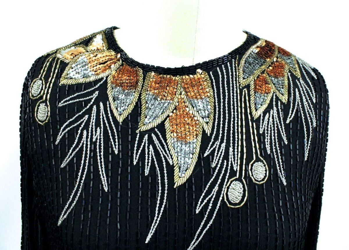 Heavily Beaded VTG 80s 2pc Silk Dress Set Black Disco Glam Sequins Bugle Beads S