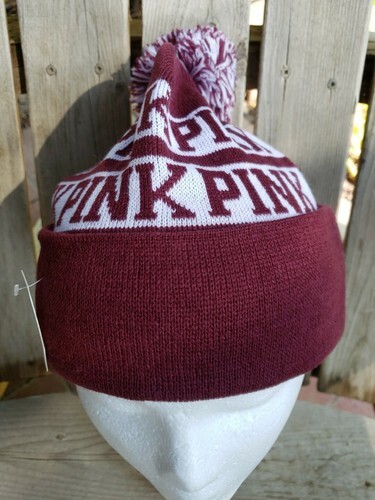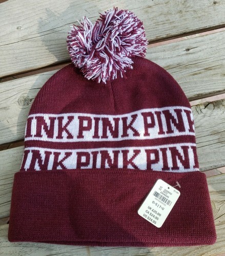 Victorias Secret Pom Pom Beanie Knit Hat Maroon PINK Logo Toque One Size Ladies
