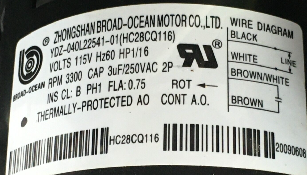 This is BroadOcean YDZ-040L22541-01 Inducer Blower Motor HC28CQ116 115V 3300 RPM 1/16 HP used used part.