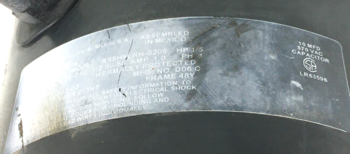 This is Emerson K55HXLRH-0208 CONDENSER FAN MOTOR 51-102008-03 1/5HP 208-230/220-240V 850 RPM used part.