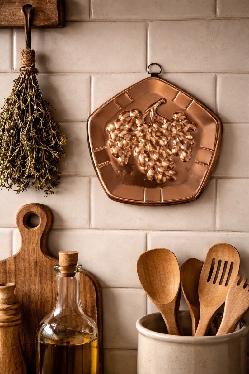 Vintage copper wall mold by **West Bend** featuring a raised grape cluster design. Made for decorative wall display, this piece includes the original hanging loop on the back. Warm copper tones and pressed grape detailing give it a classic mid-century kitchen and dining decor look, ideal for vintage kitchens, wine-themed spaces, or rustic wall displays.
