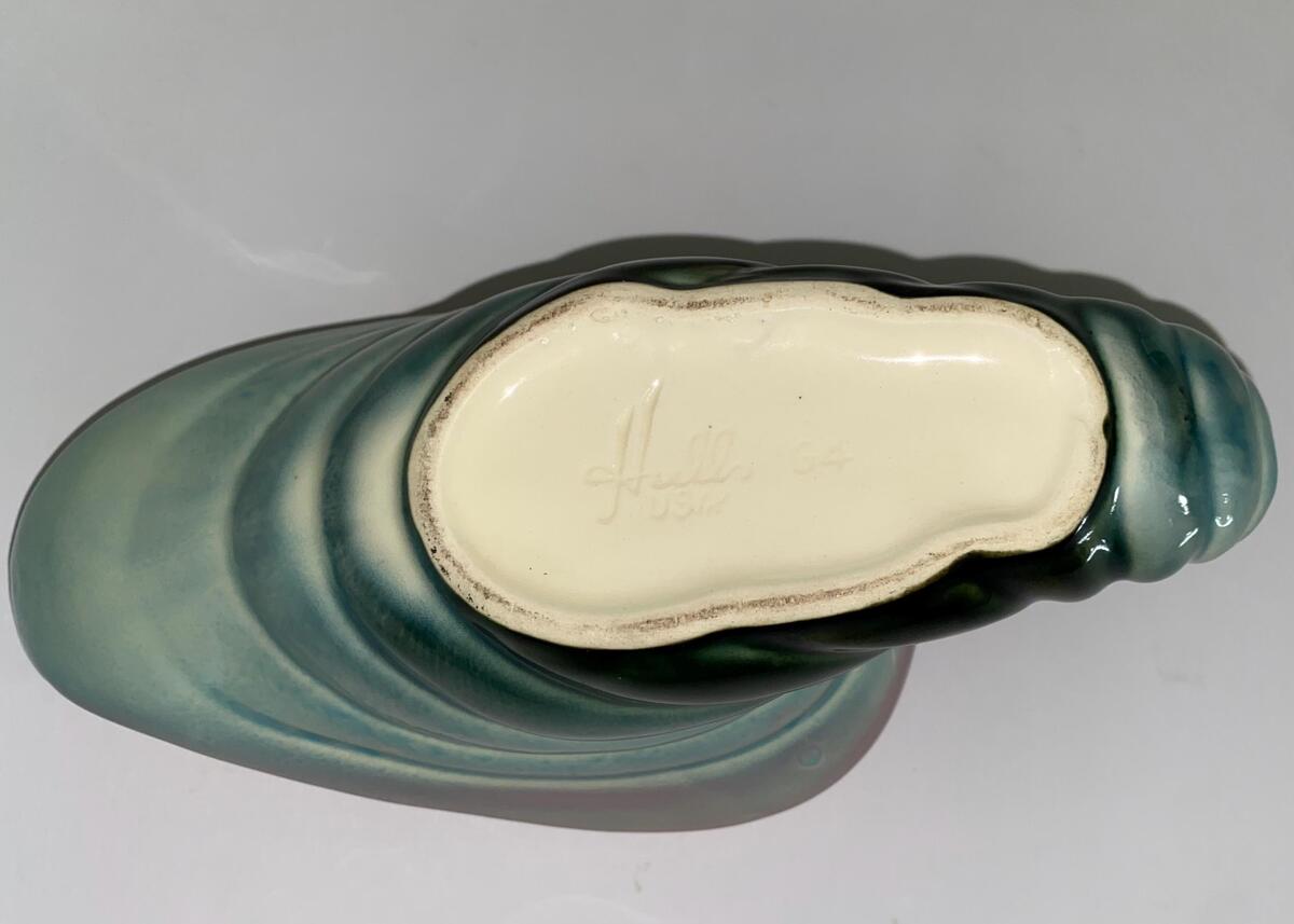 Here we have this beautiful Conch planter/vase from the 1960s. It has a curved rim and ribbed body with a high-fired glass like finish. The vibrant colors of dark greens and lighter sea greens/greys with a pink interior really make this one a unique beauty. The cornucopia measures 10.5" L x 5" W x 4.25" H. and is stamped on the bottom Hull USA 64. This Hull conch we have here is unscratched and not chipped. It's in great condition for being created in 1964. Hull pottery is the high-quality ceramics produced by Hull Pottery Company, established in Ohio in 1905 by Addis Emmet (A.E.) Hull.