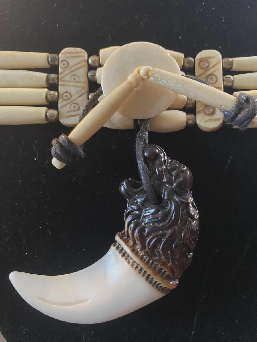 This listing features a vintage Native American styled Bone Choker Necklace.All beads and other pieces are bone the tooth is a reproduction facsimile. The leather is, well leather. This is definitely hand made with care for a woman.