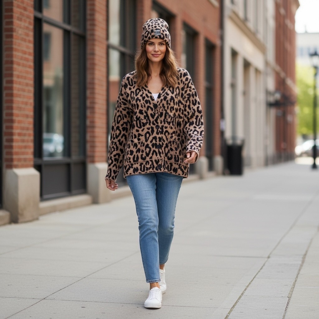 The product is a luxurious 100% Cashmere Cardigan Sweater and Hat set in a Leopard Animal Print. This stylish addition to any woman's wardrobe is perfect for casual occasions with its long sleeves, crew neck, and knit fabric. The multicolor design and leopard print theme make it a trendy choice for the winter and fall seasons, adding a touch of sophistication to any outfit. Made by the brand Cashmere, this high-quality sweater is sure to be a versatile and chic piece for your wardrobe.