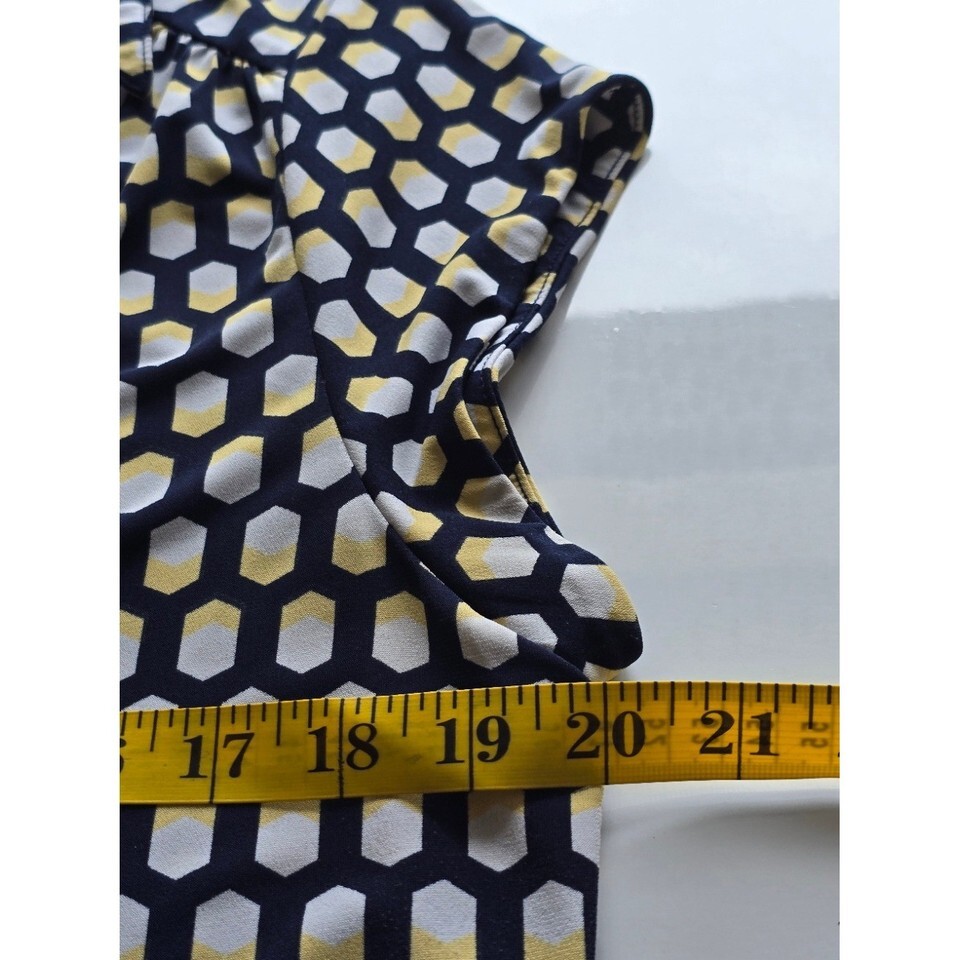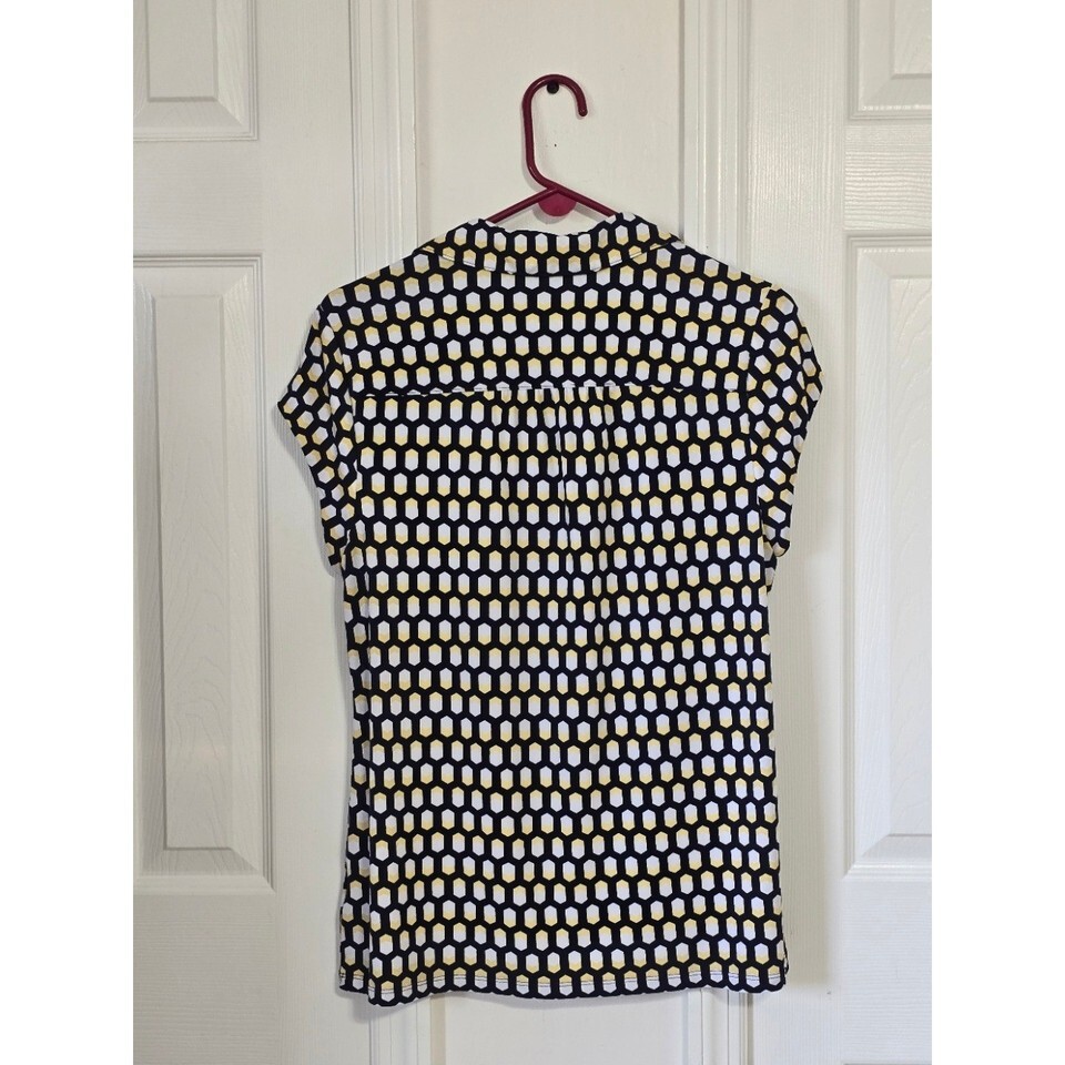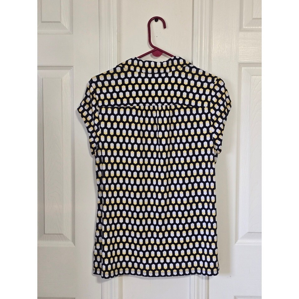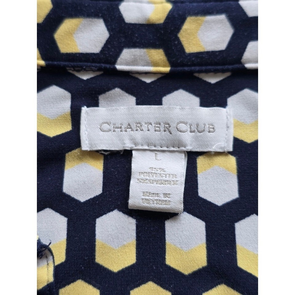 Keywords: Charter Club shirt, geometric print top, womens collared shirt, short sleeve blouse, navy yellow white top, casual workwear, stylish everyday, comfortable fit, button up blouse, womens fashion, plaid pattern shirt, lightweight top