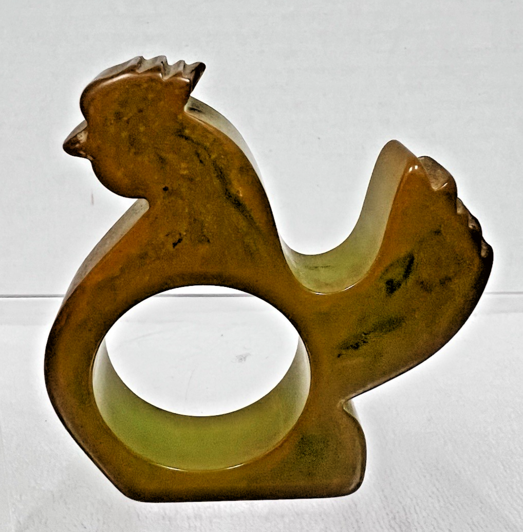 Vintage Figural Bakelite Green Marbled Rooster Chicken Napkin Ring Holder 2 1/2". Yellow green marbled Bakelite rooster chicken measures approx. 2 1/2" wide, some surface wear, rooster chicken neck feather has an old nick chip, good used condition. See pictures.