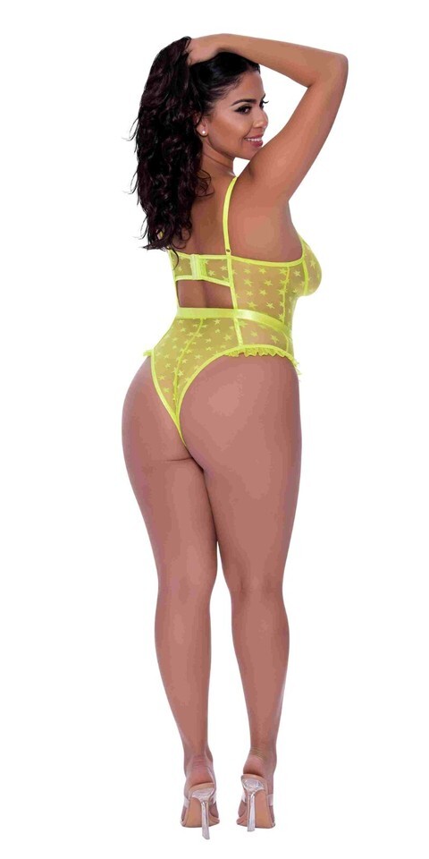 Love Star High Leg Teddy Chartreuse Lime from Magic Silk Lingerie. Magic Silk has unveiled its new Love Star line of lingerie from its Exposed collection. Indulge yourself in this beautifully designed lingerie made from sheer stretch mesh adorned in stars. Soft, feminine ruffles are finished with raw cut edges. Bedroom to festival silhouettes offer many unworldly ways to play. Care: hand wash cold water. No bleach. Dry flat. FYI Chartreuse is a yellow-green or greenish yellow, is a color between yellow and green.
