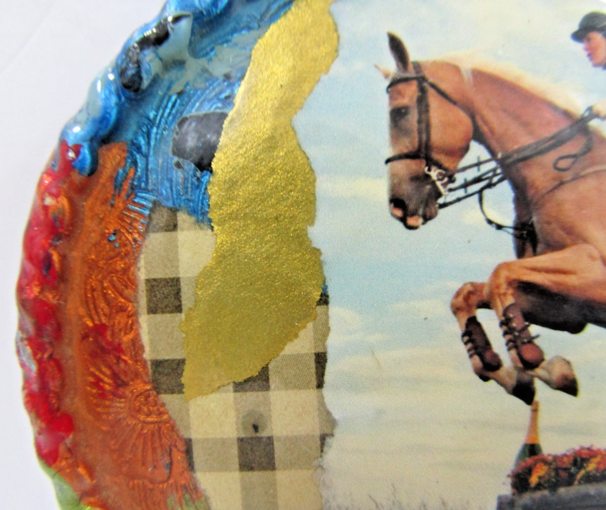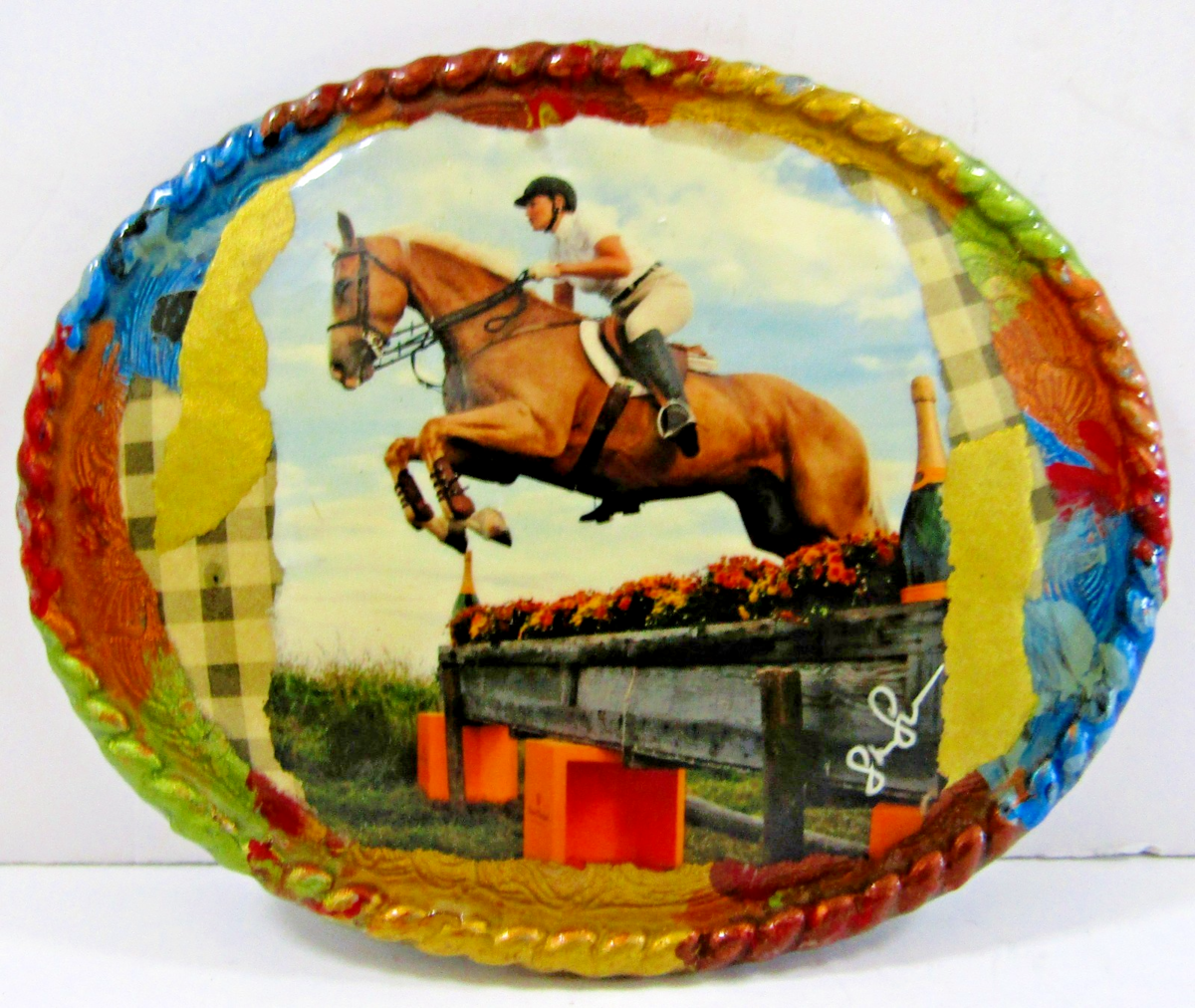 Equestrian Hand Painted Artist Signed Horse Jumping Steeplechase with Twisted Rope Border