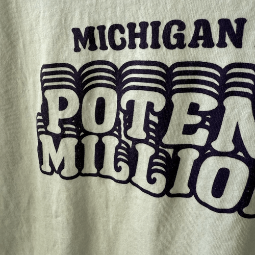 Washed but never worn, fruit and the loom 100% cotton novelty T-shirt in white with purple print on the front that says Michigan lottery potential millionaire. Humorous and hopeful. Laying flat measures 30 inches shoulder to ham and 21 inches armpit to armpit.