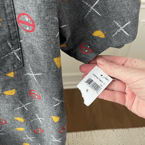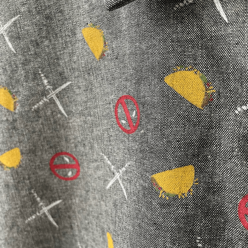 New with tags from hot topic, Marvel Deadpool Taco Party Woven Button-Up shirt with short sleeves and a black oxford background that presents as gray featuring Deadpool mask swords and tacos. The buttons are loaded with Deadpool, 100% cotton. Laying flat measures 32 inches shoulder to hem and 24 inches armpit armpit.