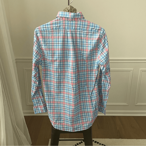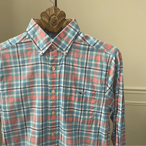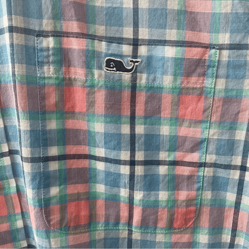 Men?s vineyard vines Tucker slim fit 100% gauzey cotton, pink and light, blue plaid, button-down collar shirt with just pocket featuring the signature embroidered whale logo. Preppy summer colors are perfect for beachfront weddings, Easter, or any occasion where you want to look classically put together. Period measurements are approximate and taken while laying flat: 28.5 inches shoulder to hem and 20 inches armpit to armpit.
