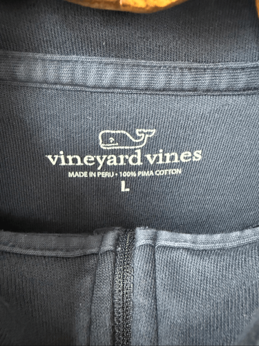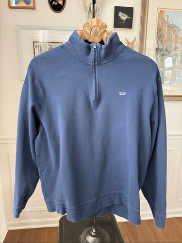Exactly a sweater, not exactly a sweatshirt and not exactly a T-shirt so please read description. Men?s vineyard vines dark blue 100% Pima cotton quarter zip pull over with embroidered whale at the chest. Not exactly a sweatshirt, although it would appear like a polished sweatshirt from the outside, but it does not have a fleece lining. It is more weighted than a T-shirt and it isn?t knit like a sweater, but it is nice enough for sweater wear. Tag size large measuring 25 inches shoulder to hem and 24 inches armpit to armpit.