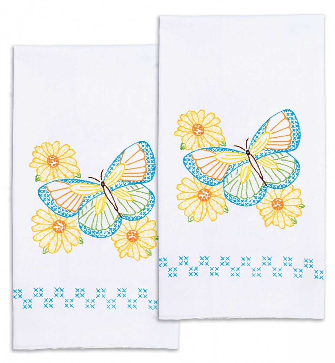 Jack Dempsey Needle Art Butterfly Decorative Hand Towels. Butterfly Hand Towels. Stamped for Cross-Stitch and Embroidery. Package contains two matching - 17 inch x 28 inch decorative hand towels. Made of cotton/poly broadcloth, with easy to follow instructions. Also includes instructions for two color designs. Ink washes out. 100 Percent made in the U.S.A. Item Number: 320-967. CHK-320-967