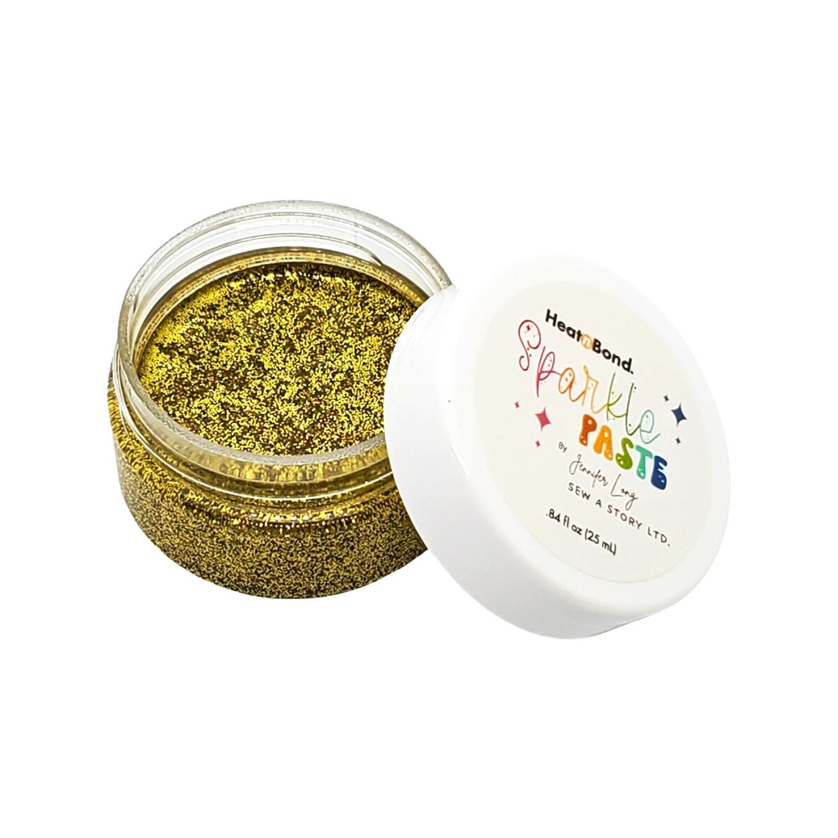 HeatnBond Sunshine Color Sparkle Paste By Jennifer Long Sew a Story 19156. Sparkle Paste is a heat-activated adhesive that adds a layer of glitter and shine to fabrics. Whether you are working on quilts, garments or home decor, Sparkle Paste brings a fun, radiant touch without the mess of traditional glitter. Available in 14 glittery, glistening shades, Sparkle Paste can be applied with a paintbrush to create freehand designs or with a small palette knife to create precise stenciled details. Each jar contains .84 fl. oz of Sparkle Paste. Color: Sunshine. CHK-SP-19156