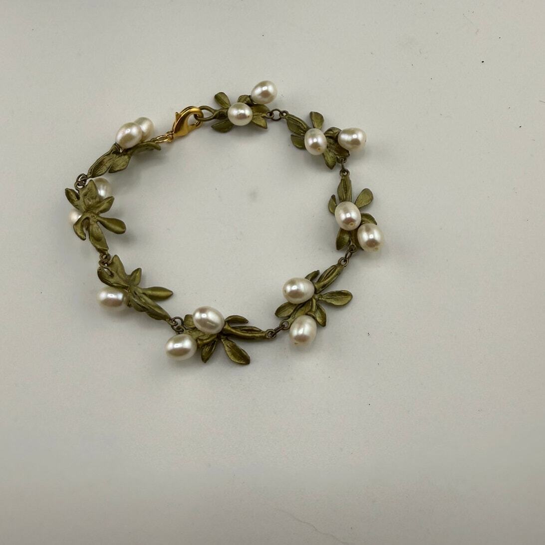The Bracelet by Michael Michaud is a piece of artistry, crafted from cast brass and includes clusters of white pearls. 7.75 inches. A gorgeous piece by botanical jewelry designer Michael Michaud. It captures the beauty and exquisite detail of nature using soft patinas on bronze accented with pearls, beads, stones, and more. His attention to detail results in true to nature, botanical jewelry. Michael Michaud uses an actual leaf, branch, or flower in place of the wax model. A mold is created around the botanical element and, as it is heated, the plant matter burns away and leaves behind a beautifully detailed mold of itself. Michael Michaud Jewelry is renowned for its beauty and workmanship and is featured in the finest museums, galleries, and specialty retailers around the world. Many collections are commissioned by leading museums such as The Victoria Albert Museum, The Art Institute of Chicago, The National Gallery of Art, and the Chateau de Versailles.