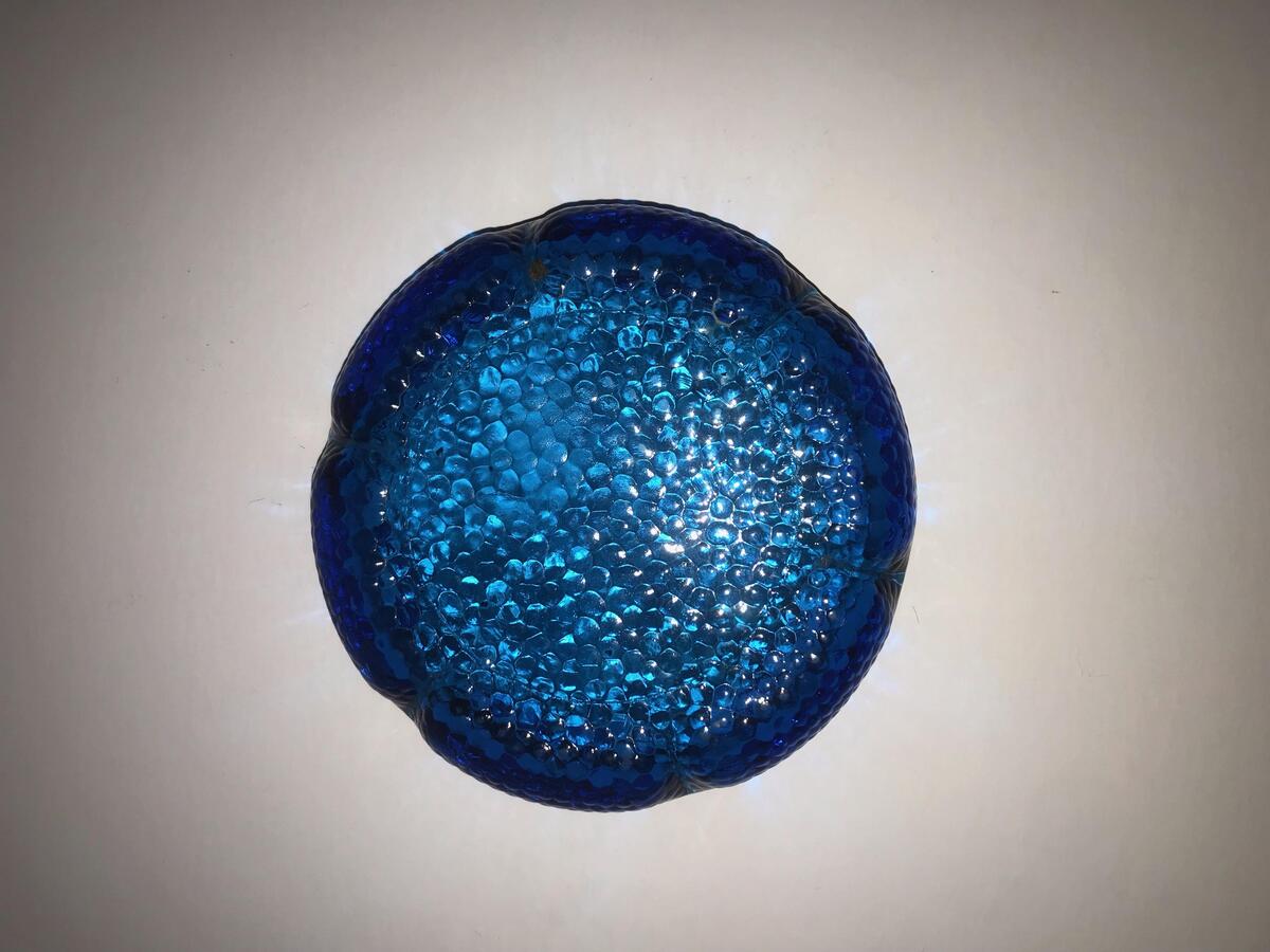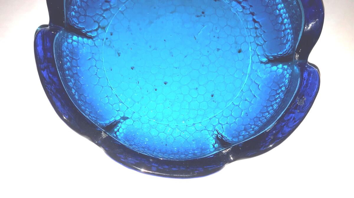 This beautiful piece of vintage art glass is a classic example of Mid-Century Modern design, widely attributed to Blenko or similar makers like Anchor Hocking. The exterior bottom features a unique, tactile pebbled finish, a signature design element. Originally designed as an ashtray, it functions beautifully as a trinket dish, candy bowl, catch-all, or simply as a stunning piece of decor. Made from heavy, high-quality glass with a glossy finish and scalloped edges. This item is in excellent vintage condition with no chips, cracks, or significant scratches. Its vibrant, deep blue hue and distinctive lotus flower or petal shape will add a pop of retro color to any space.