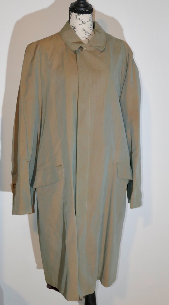 This Vintage Balmacaan Single Breasted Trench Coat is a classic and stylish outerwear piece perfect for the business occasion. The long jacket features a solid pattern with a hidden button closure, making it a versatile and timeless option for all seasons. This has no tags but measures approx. 27.5" from pit to pit and 41" from shoulder to bottom hem and 25.5" sleeves. The fabric has a subtle, lustrous iridescent satin sheen appearance. With a vintage appeal and a regular fit, this coat exudes a sophisticated and timeless style that is sure to turn heads.